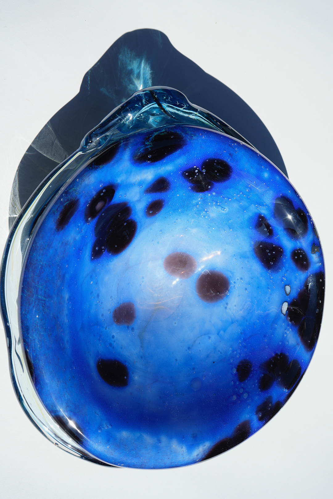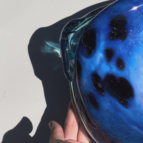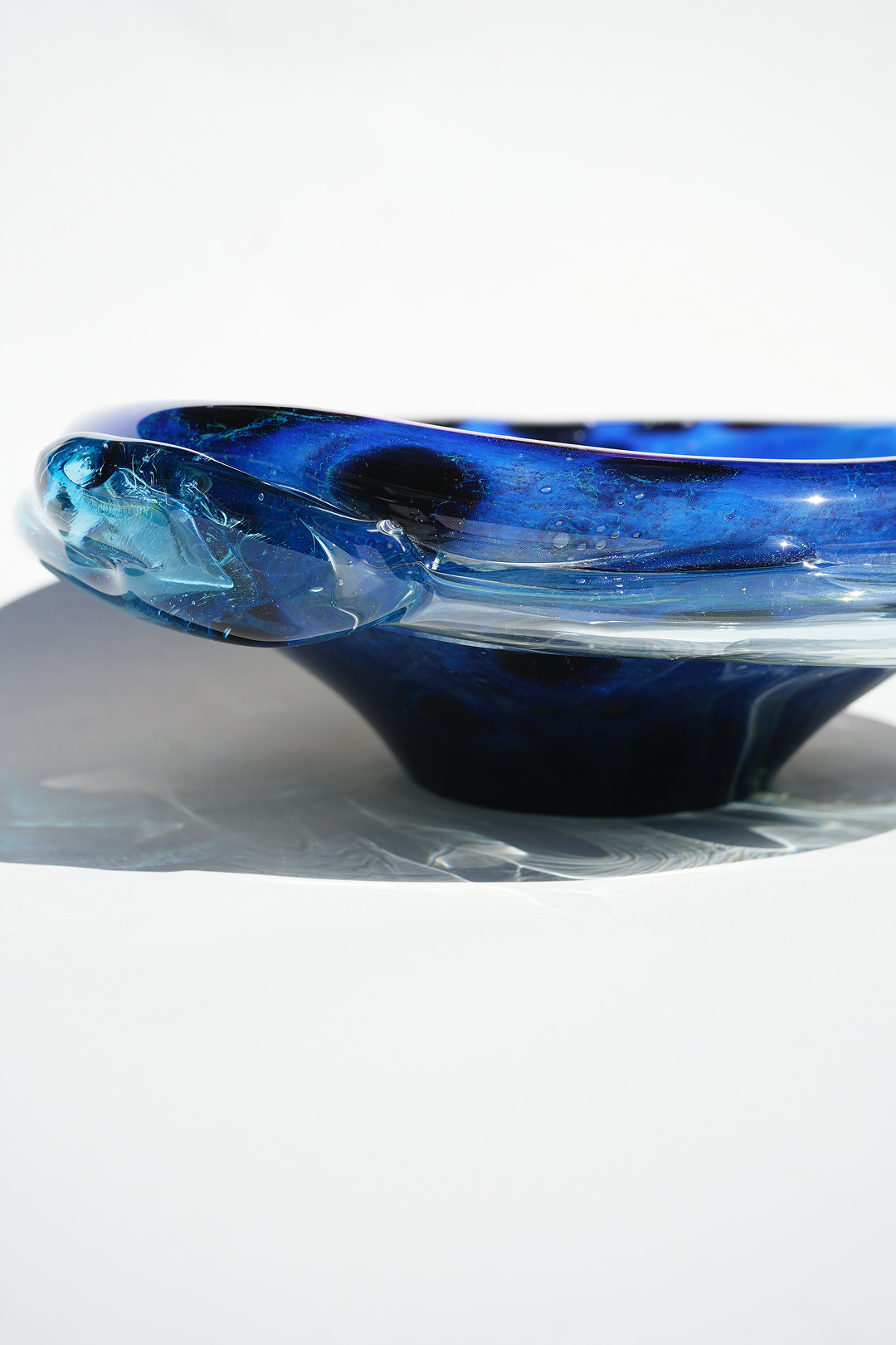 Le vase est dominé par un bleu cobalt et outremer profond, qui se transforme en des tons aigue-marine plus clairs et translucides sur les bords, là où la lumière le traverse. De larges taches d'obsidienne d'un noir d'encre sont suspendues dans le verre, imitant l'apparence de pierres sombres au fond d'une piscine ou de créatures des profondeurs dérivant au gré du courant.