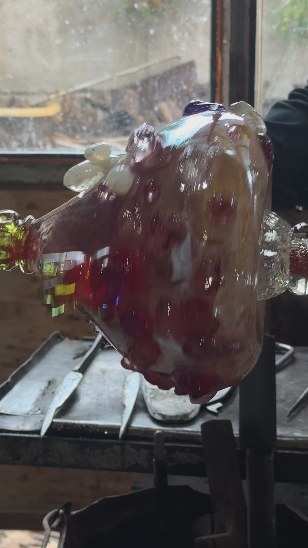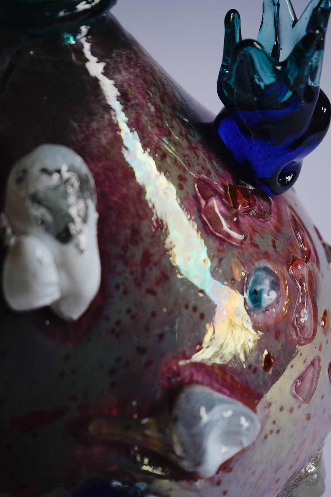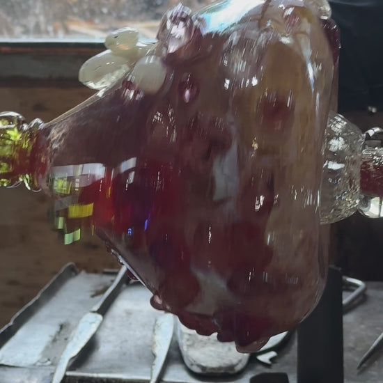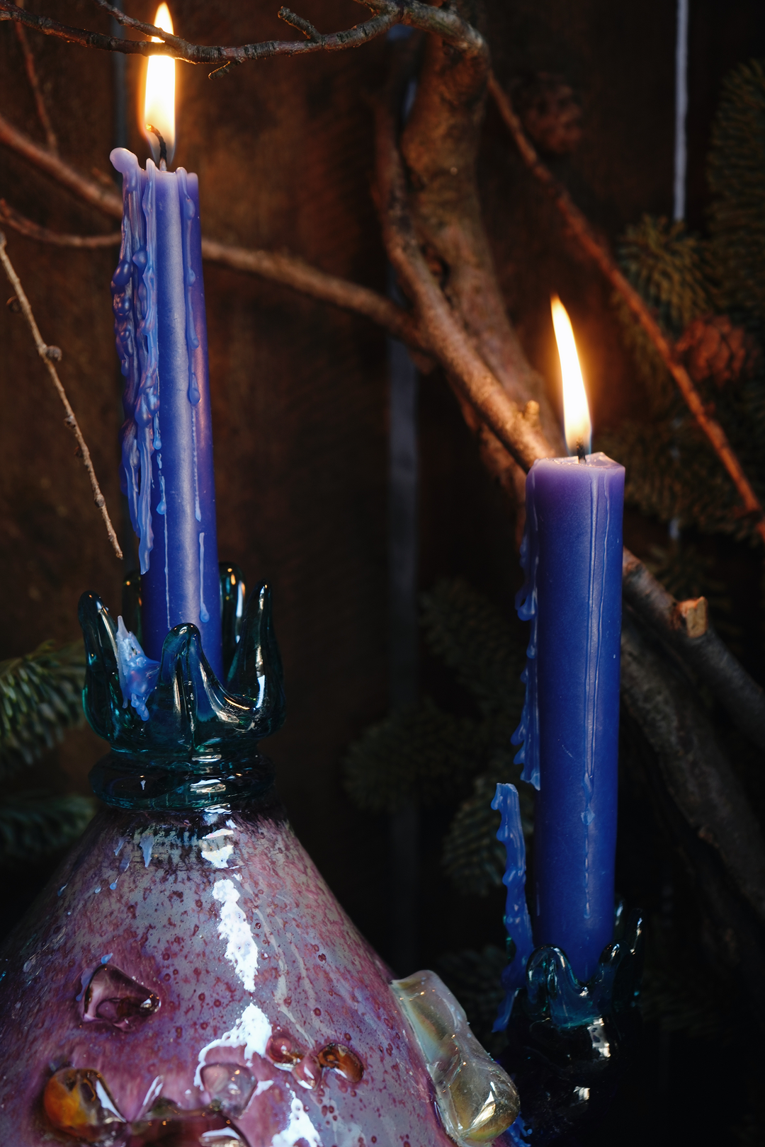 This handcrafted blown-glass candelabra is a study in organic form and celestial textures. Its silhouette, reminiscent of a flowr bud or an iridescent pomegranate, features a tapered body of mottled amethyst and plum hues.