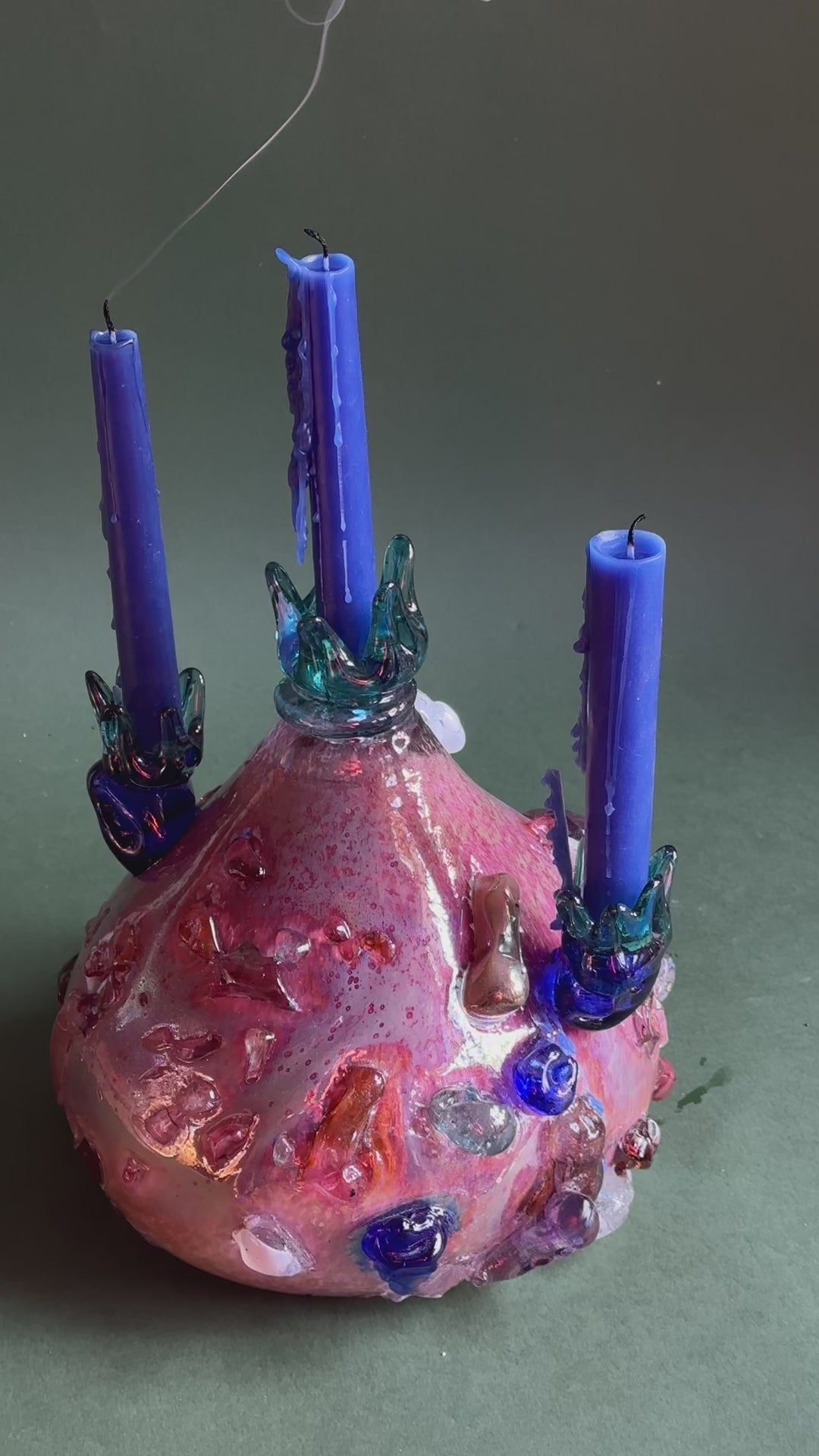 The surface is encrusted with fused glass "jewels" — translucent shards in sapphire, amber, and milky quartz — that catch the light like raw gems embedded in stone. Rising from the vessel are three teal glass crowns, sculpted with fluid, flame-like peaks to securely cradle slender tapers.
