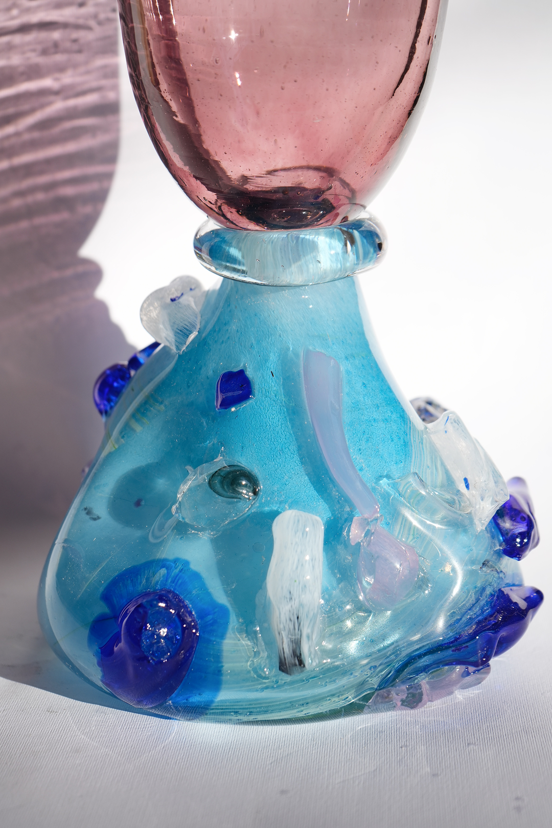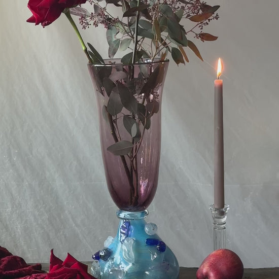 The foundation is a striking departure from the sleek top. Crafted from cerulean and sea-foam blue glass, the base is thick and weighted, featuring an "applied" technique where molten glass droplets have been fused to the surface. These cobalt and clear protrusions give the Flower buds, resembling also coral or ice.